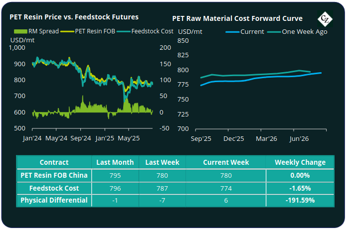 The average weekly PET resin physical differential against raw material future costs decreased USD 4/tonne to USD zero/tonne last week. By Friday, the daily differential was at positive USD 6/tonne.