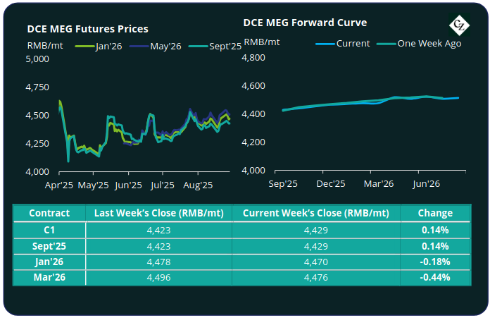 The MEG Futures forward curve kept unchanged with the Jan’26 holding just a RMB 41/tonne premium over the current month, and the Mar’26 holding a RMB 27/tonne premium.