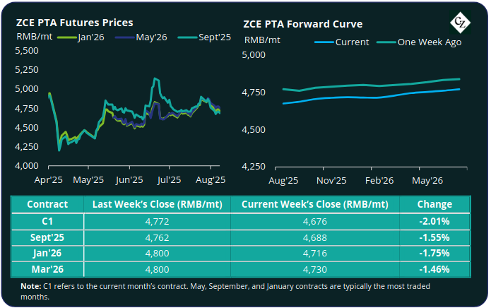 The PTA forward curve remains relatively unchanged; the Jan’26 contract has a RMB 40/tonne premium to the current month’s contract, and Mar’26 with a RMB 54/tonne premium.