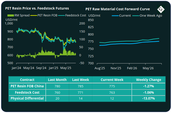 PET Resin Futures also softened, with main month contracts down by an average of 1%; Sept’25 contract months fell by 1.15% versus the previous week.