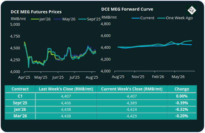 The MEG Futures forward curve kept relatively flat with the Jan’26 holding just a RMB 17/tonne premium over the current month, and the Mar’26 holding a RMB 23/tonne premium.