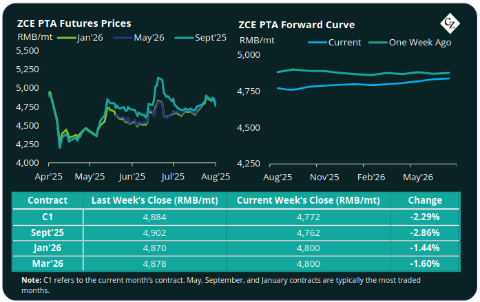 The PTA forward curve remains flat through to the beginning of 2026, having previously been backwardated for much of H1 2025. The Sept’25 contract is now at just a RMB 10/tonne discount to the current month’s contract, and Jan’26 with a RMB 28/tonne premium.