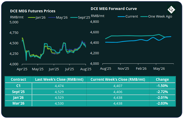 The MEG Futures forward curve kept relatively flat with the Sept’25 contract flat against the current month and the Jan’26 holding a RMB 31/tonne premium.