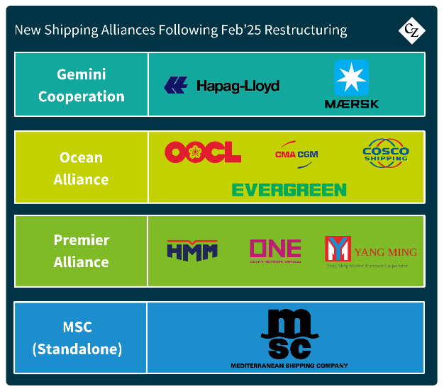 Since February 2025, the container shipping industry has undergone significant restructuring among the major ocean carrier alliances.