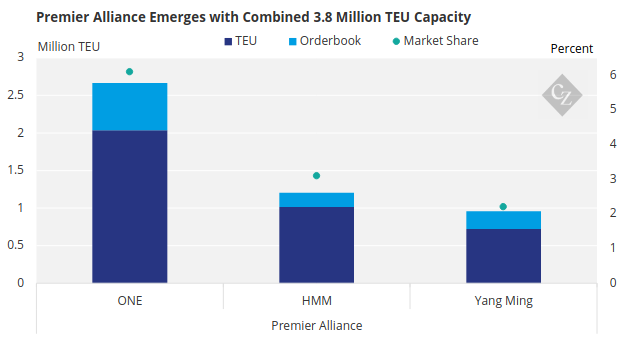 ONE, HMM and Yang Ming have decided to continue their collaboration, forming a shipping group – the Premier Alliance – with a combined capacity of around 3.8 million TEUs—significantly smaller compared to their competitors in terms of total capacity.