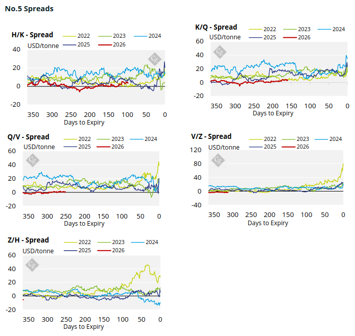 The No.11 raw sugar futures traded higher throughout last week but remained in the 14-15c/lb range. The No.5 refined sugar futures also traded higher over the past week. Both the No.11 and No.5 forward futures curves have strengthened across the board.