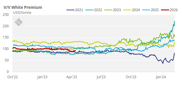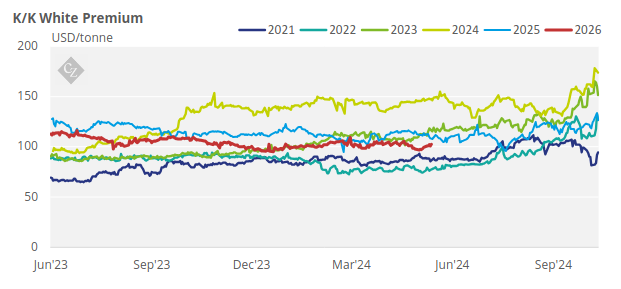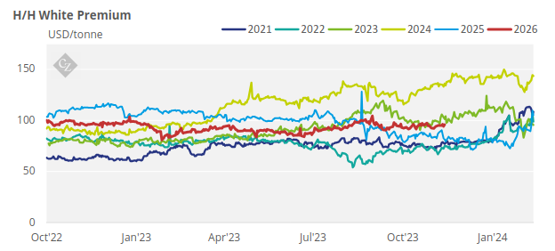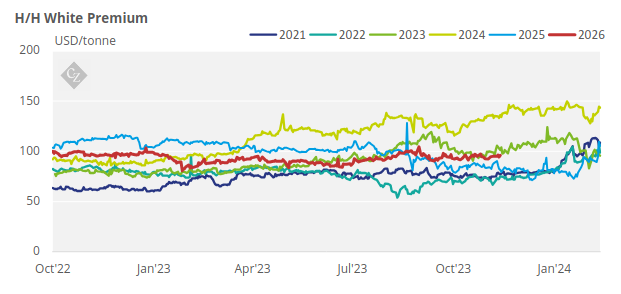 The H/H white premium traded the past week between USD 95-96.3/tonne, with the exception of Thursday when it hit USD 94.3/tonne.