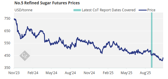 Refined sugar futures strengthened throughout the last week, starting at USD 408.2/tonne, hitting USD 417.8/tonne on Wednesday to then close at USD 431.6/tonne on Friday.