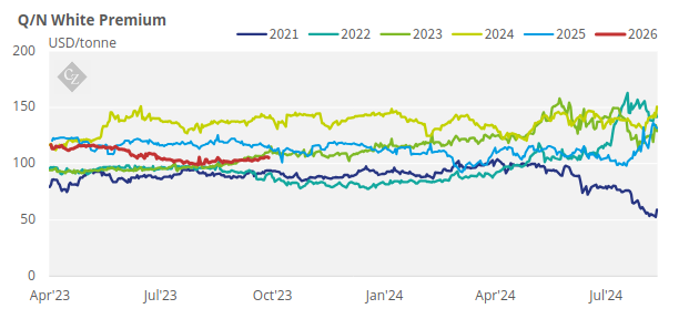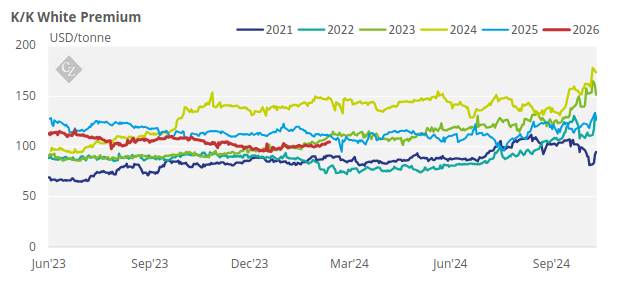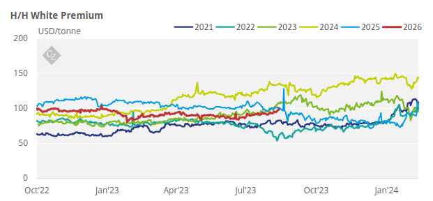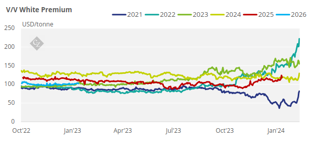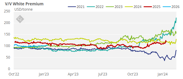 The V/V white premium traded at USD 111.4/tonne on Monday, moving higher through the rest of the week hitting USD 123.9/tonne on Thursday, eventually closing at USD 118.8/tonne on Friday.