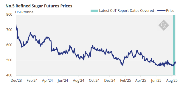 The No.5 refined sugar futures started the week trading at USD 474.9/tonne, increasing from here on and hitting a high of USD 489.4/tonne and eventually closing at USD 481.2/tonne on Friday.