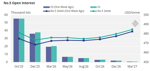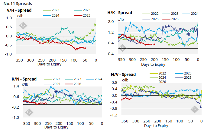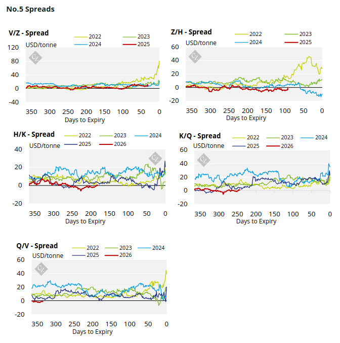 The No.5 refined sugar futures curve has continued to strengthen across the board.