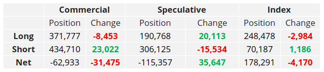 Speculators have closed out 15.5k lots of short positions, a reversal of last week’s increase in spec shorts. Speculators have increased their long positions by 20.1k lots of longs.