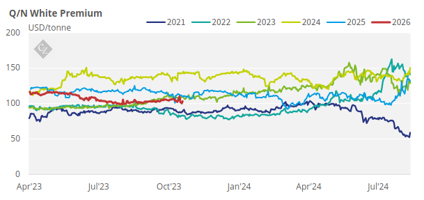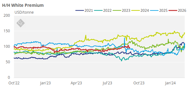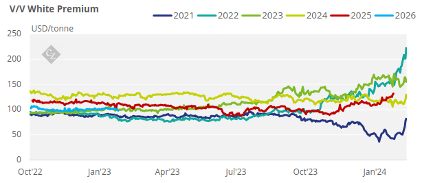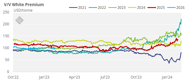 The V/V white premium weakened over the past week starting the week at USD 141.2/tonne as it then drifted lower to hit a mid-week low of USD 131/tonne on Wednesday and eventually closed at USD 135.7/tonne on Friday.