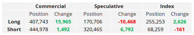 End-users continued adding to their cover heavily with prices moving lower, as they increased their commercial long position by 16k lots of longs. Producers opened a smaller volume of short positions at just 1.5k lots of shorts.