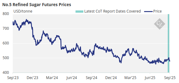 The No.5 refined sugar futures have moved lower over the past week as it opened at USD 502.1/tonne at the start of the week before closing at USD 478.5/tonne on Friday.
