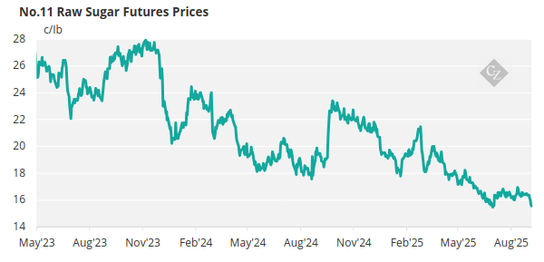 Raw sugar futures traded lower last week, settling at 15.6c/lb on Friday after starting the week at 16.4c/lb.