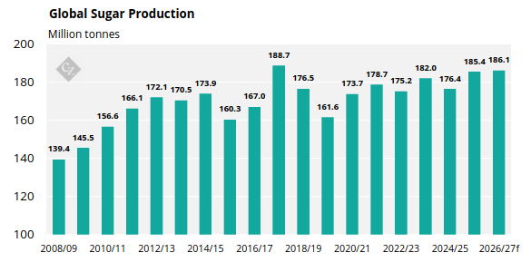 For 2026/27 we anticipate another year of strong sugar production at 186.1 million tonnes which would be the second highest on record. However, this figure is extremely tentative.