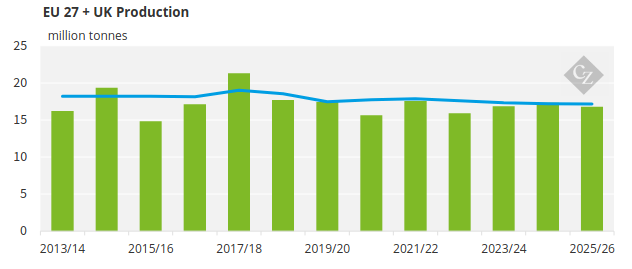 This means that while we are currently forecasting EU+UK sugar production at 15.8 million tonnes in 2026/27, if farmers do drastically cut beet acreage we could revise lower, perhaps below 15 million tonnes.