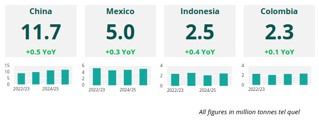 Our estimate for global production is down by 1 million tonnes from the previous update. We now think that global sugar production will reach 185.4 million tonnes in 2025/26.