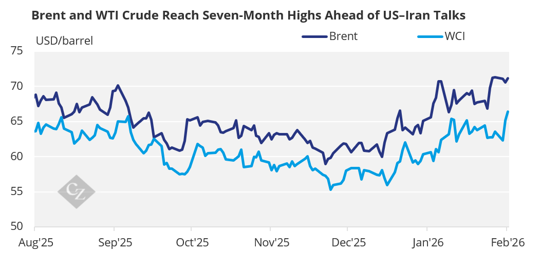 Upcoming US-Iran Talks Boost Oil Prices: Oil hovered near seven-month highs ahead of Thursday’s Geneva talks between the US and Iran, as tensions over nuclear and missile programmes stoked supply concerns. Brent reached USD 71.10 and WTI USD 65.84, while Iran-China arms discussions and rising US crude stockpiles added further market uncertainty.