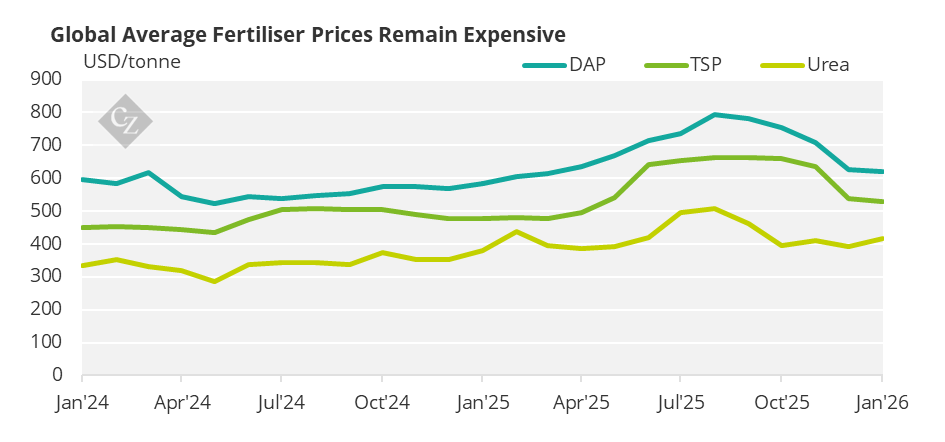 Analysts warn that fertiliser prices remain the top threat to 2026 farm profitability, with phosphate use in North America down 20% in fall 2025 and uncertainty over spring demand. Despite cutbacks, US corn acreage (93–95 million acres) keeps demand high—especially for nitrogen.