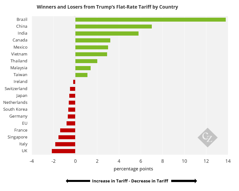 This compresses previous differences, reducing the penalty on some countries while raising costs for others, and redistributes relative trade advantages without easing overall protectionism.