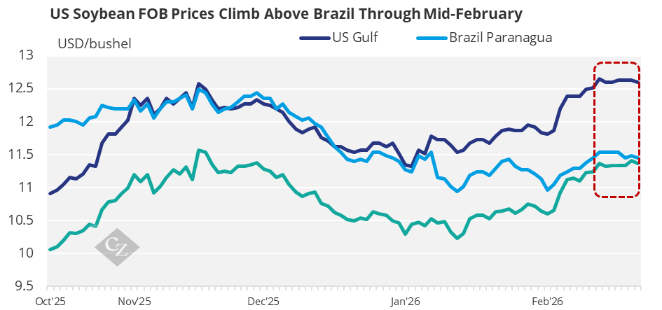 China completed its initial purchase commitment of 12 million tonnes of US soybeans made in October, but more than 40% of those purchases have not yet been shipped. Cancellations of sales and/or the evaporation of an additional 8 million tonnes of Chinese purchases hinted at by Trump in early February would undercut the rally that boosted Chicago’s March 2026 futures price from USD 10.60/bushel in early February to a peak of USD 11.41 on February 19—close to the highs previously reached in November 2025. US FOB prices were at a substantial premium to Brazilian prices during mid-February.
