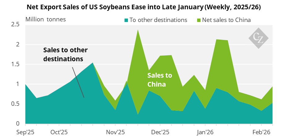 The pace of US soybean sales to China had slowed by late January. Sales to non-China destinations also slowed after their October peak, as higher US prices cooled demand.