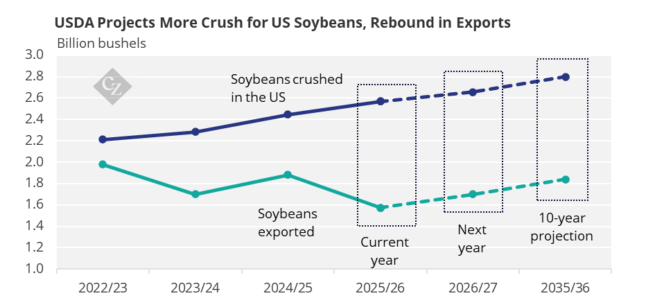 For US soybeans, the USDA projects growth in domestic crush attributed to federal and state-level mandates for blending renewable fuels for automobiles, aircraft, and ocean-going vessels. Projections show crush rising steadily from 2.57 billion bushels in 2025/26 to 2.655 billion bushels in 2026/27 and 2.8 billion bushels in 2035/36.