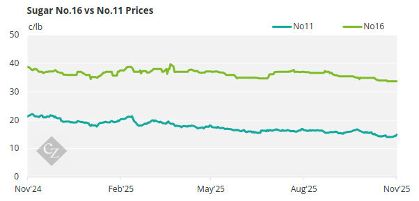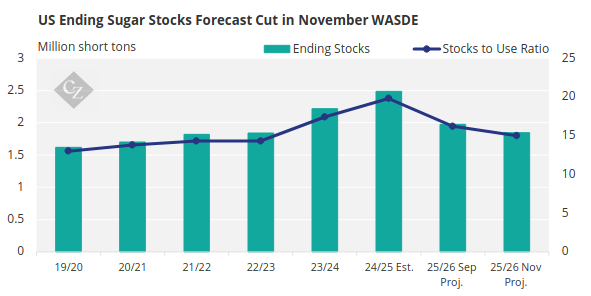 In the latest WASDE report, released November 14, the USDA raised its estimate for 2024-25 ending stocks but cut its forecast for 2025-26. For the current year, lower domestic sugar production and higher deliveries more than offset higher beginning stocks and higher imports, dropping the ending stocks-to-use ratio to 15% from 16.2% in September.