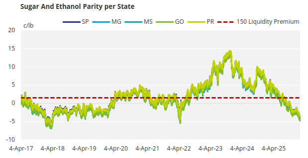 We are close monitoring the parity all CS Brazil states. Mills in border states such as Mato Grosso do Sul and Goiás were the first to respond to weaker sugar prices, swiftly shifting production toward ethanol. As the new crop season begins in April, production flexibility is likely to increase further, requiring continuous tracking of mix decisions.