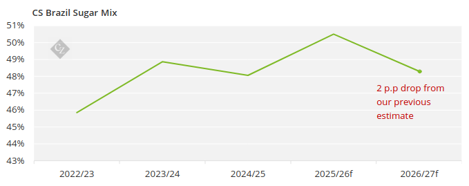 Last week, we revised our estimates for the 2026/27 harvest in the Center-South. Given the low levels of pricing so far, we expect a more dynamic harvest in terms of production decisions by the mills. As a result, we reduced our mix forecast to 48.3%.