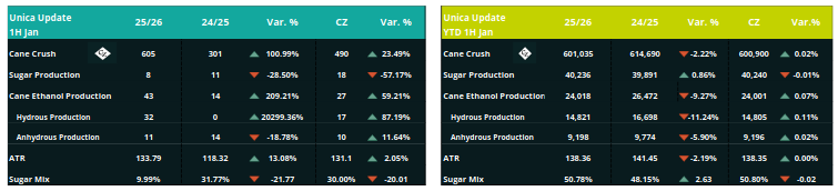 UNICA released today the harvest data for the first half of January of the 2025/26 harvest.