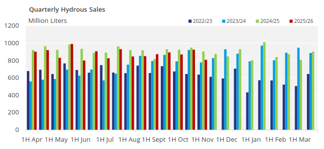 The higher volume of anhydrous is a result of the blend increase in August, which rose from 27% to 30%. The reduction in hydrous sales is explained by the parity slightly above the last harvest, which ended up impacting the hydrous market share.