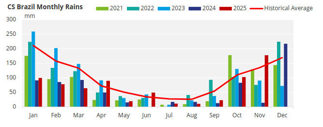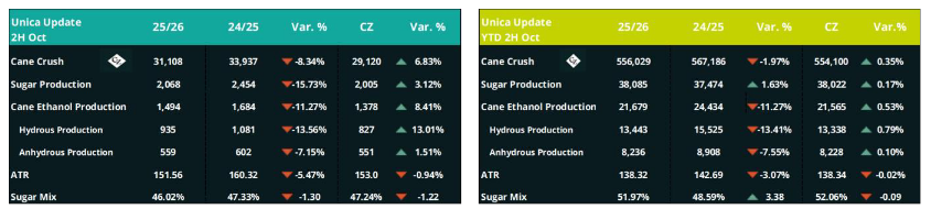 UNICA released its update for the second half of October today. The data continues to indicate a stronger diversion of sucrose toward ethanol production. ATR declined due to the significant rainfall recorded throughout October. Even so, robust cane crushing levels continue to support the projection of 40.2 MMT of sugar for the 2025/26 season.