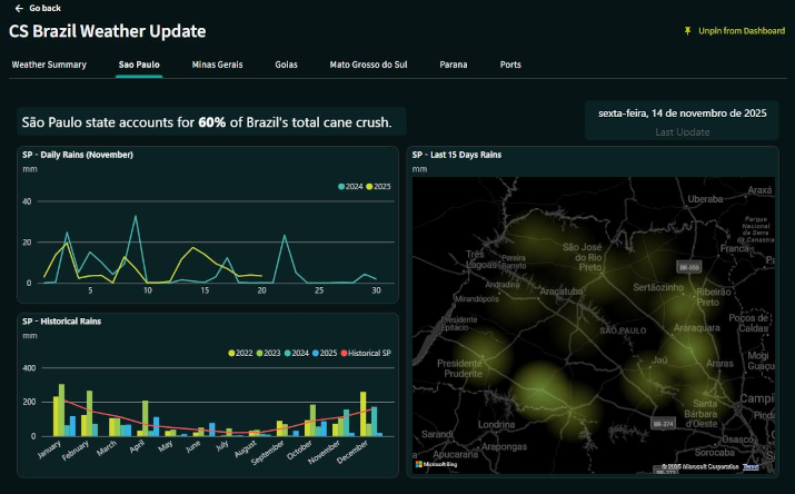Regarding cane quality, a 5% decrease was observed between the first and second halves of October. This decline is linked to the increase in rainfall during the month, marking the beginning of the wet season in Brazil. In the second half of October, the Center-South region experienced two days of operational shutdowns due to rain, further contributing to the reduction in cane quality.
