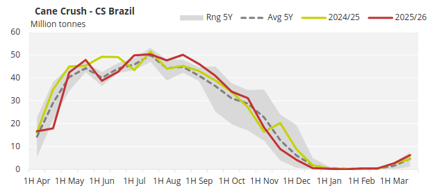 Despite the reduction in the production mix and ATR, cane crushing and sugar output remain strong, supporting the projection of 40.2 million tonnes of sugar for the 2025/26 CS Brazil season.