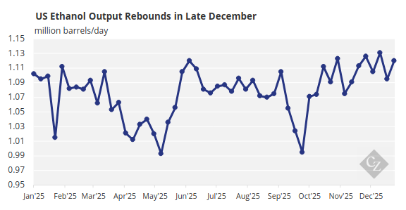 According to the latest data from the EIA, ethanol production moved higher late in December, offering continued demand for corn even as fuel consumption softened at year’s end. Output rebounded to 1.12 million barrels per day during the week ending December 26, equivalent to 47 million gallons per day, according to EIA data analysed by the RFA.