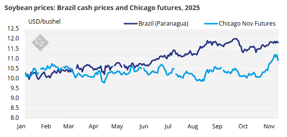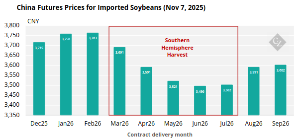 But whether these commitments translate into sustained buying remains uncertain. We discussed how Brazil’s 169-million-tonne 2025 soybean crop — with another record harvest forecast for 2026 — continues to suppress prices and narrow the brief window in early 2026 when US beans may be commercially competitive. China’s Dalian futures market reflects this dynamic, pointing to only a short period of potential US viability before new-crop Brazilian supplies arrive.