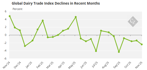Global Milk Supplies Outpace Demand: Farmers face a “bumpy ride” as global milk production outpaces demand, with inventories building and commodity prices under pressure, according to a recent report. The Global Dairy Trade index has fallen six times in a row, led by Cheddar (-6.6%) and butter (-4.3%). EU production is mixed, with growth in Ireland and Poland offset by declines in France, Germany and the Netherlands, while margin pressures are expected into 2026.