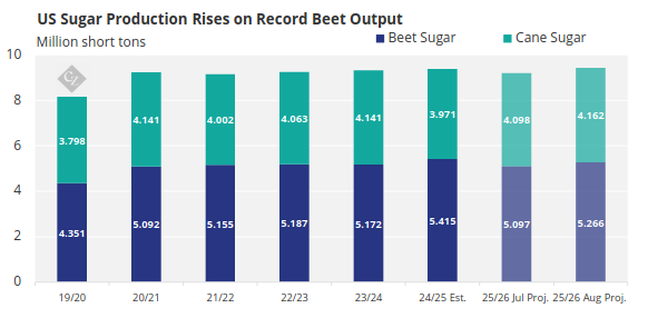 In the August 12 WASDE report, the USDA forecast total domestic sugar production at 9,386,000 short tons (8,514,835 tonnes), raw value, up 91,000 short tons from July and up 73,000 short tons from 2023-24. This included beet sugar at 5,415,000 short tons, up 93,360 short tons from July and up 243,000 short tons from last year, and cane sugar at 3,971,000 short tons, down 2,000 short tons from July and down 170,000 short tons from 2023-24. If realised, beet sugar and total sugar production would reach record highs in 2024-25, while cane sugar and total sugar production would set new records in 2025-26.