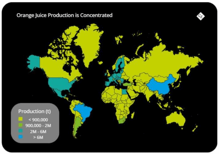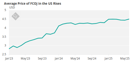 This has caused frozen concentrated orange juice (FCOJ) prices to rise globally. For US consumers, additional tariffs are likely to push prices up further.