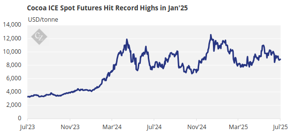 Cocoa prices hit record highs in January 2025, driven by supply challenges in West Africa and strong demand. Although prices have since stabilised, they remain elevated, maintaining pressure on the industry.