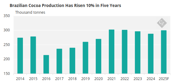 Amid these challenges, Brazil is positioning itself as a growing force in global cocoa production. Expected to harvest 300,000 tonnes this year—a 4% increase from 2024—Brazil aims to reach 400,000 tonnes by 2030. Unlike traditional smallholder farms, large agribusinesses in regions like Bahia are investing heavily in seedlings, irrigation and modern management practices, achieving yields up to six times the national average.