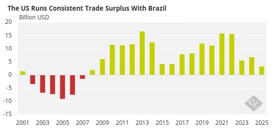 Brazil has run a trade deficit with the US since 2007, buying about USD 3.2 billion more than it sells in 2025, according to data from the US Census Bureau.
