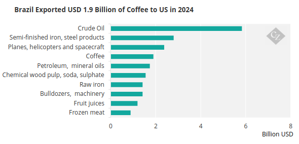 Brazil’s primary export to the US in value terms is crude oil, according to data from Comex. However, the data show that in 2024, Brazil exported USD 1.9 billion worth of coffee, USD 1.19 billion worth of fruit juices and USD 885 million of frozen meat to the US.