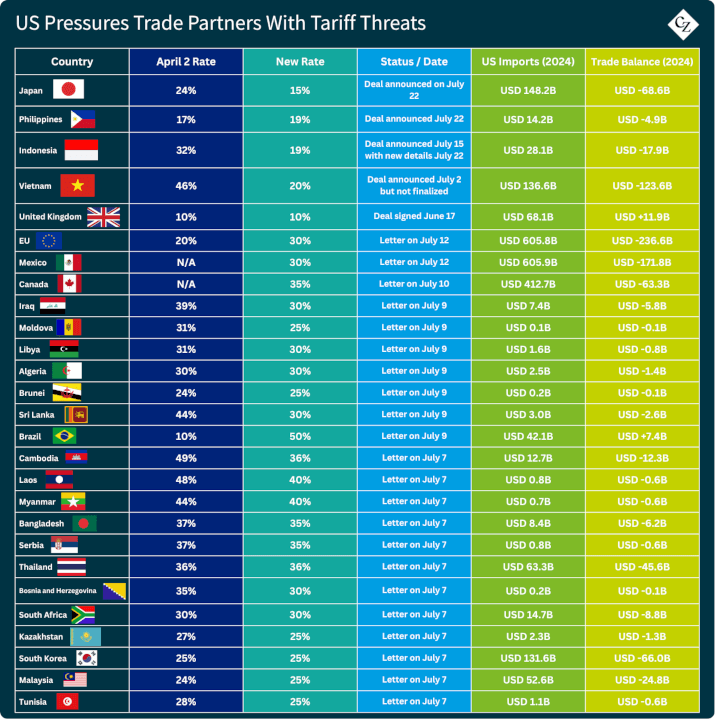 So far, five countries (Japan, the Philippines, Indonesia, Vietnam and the UK) have announced deals with the US. A further 22 countries have received letters from the president since July 7 threatening rates as high as 40%.
