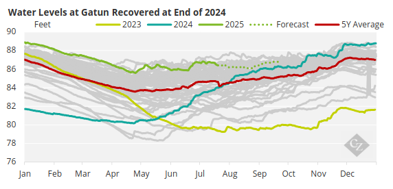 Throughout 2025, rainfall at the Gatun Lake – the main feeder for the Canal – has been consistently above the five-year average.