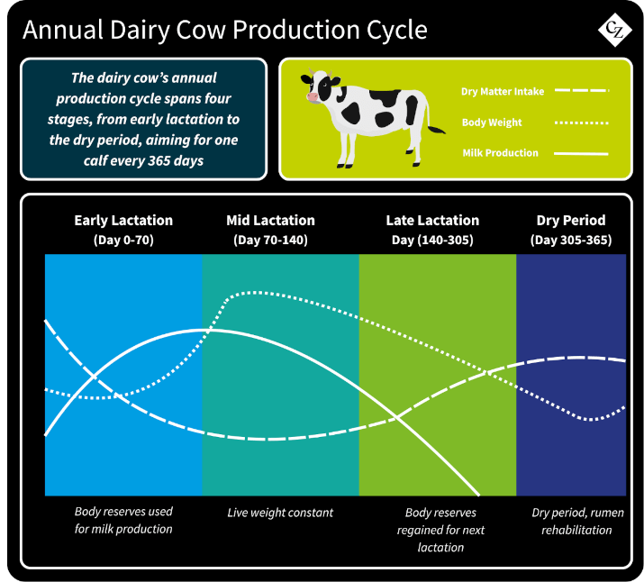 Understanding the cow’s production cycle provides the basis for a feeding strategy and helps explain her differing energy requirements at each stage.
