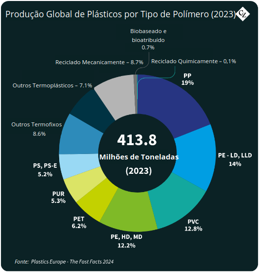 PS, PE, PP, PVC e PET representam cerca de 60% da produção global de plástico. Estes são os mais prevalentes e cujas propriedades os tornam adequados para uso na solução de muitas necessidades do nosso cotidiano.